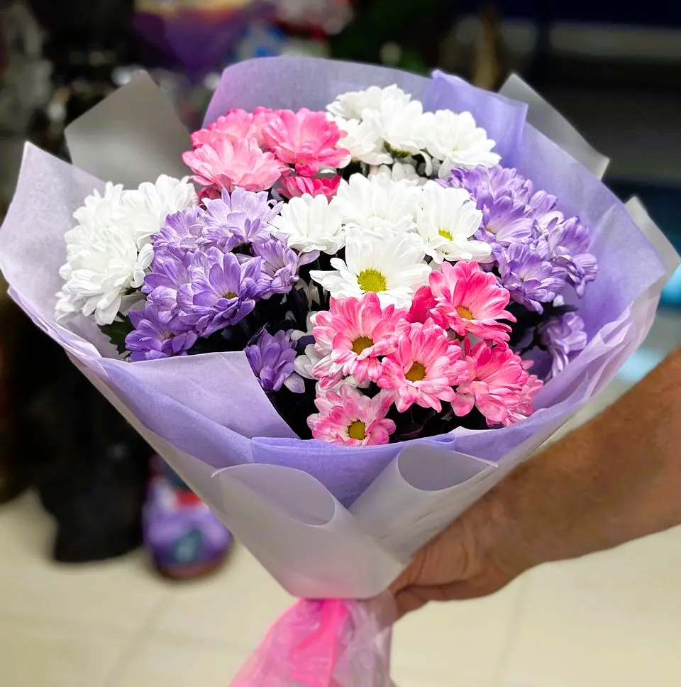 Розовые хризантемы символизируют нежность и теплоту, они дарят радость и создают атмосферу уюта. Их изящные лепестки добавляют в букет нотки романтики и привносят ощущение лёгкости. Фиолетовые хризантемы, в свою очередь, олицетворяют благородство и загадочность. Их глубокий цвет привлекает внимание и подчеркивает индивидуальность композиции.