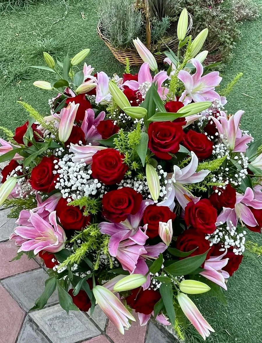 Корзина мечты из розовых лилий и красных роз