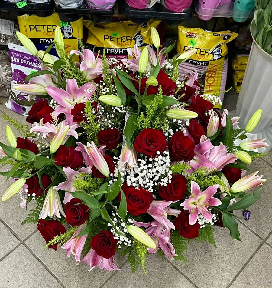 —Корзина мечты из розовых лилий и красных роз
