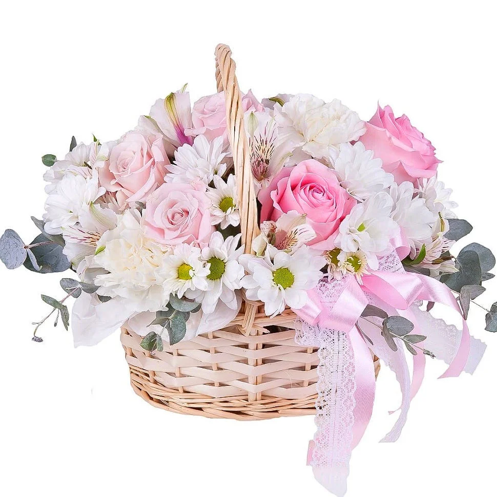 Состав: розы, гвоздики, альстромерии ,кустовые хризантемы., зелень, оазис, корзина.