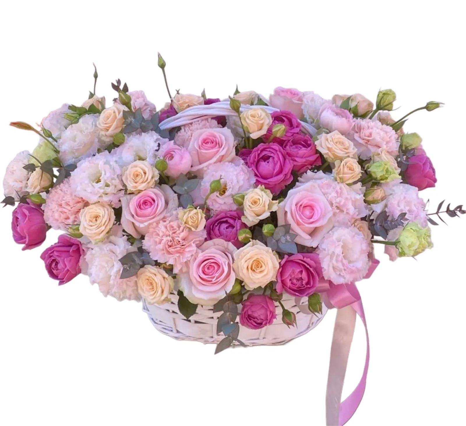 Вариант—Стандарт - роза - 4 шт., пионовидная роза, кустовая роза - 5 шт., гвоздика - 2 шт., эустома - 3 шт., зелень, оазис, корзина