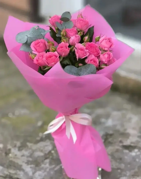 кустовые розы-3шт, зелень, упаковка, лента |
