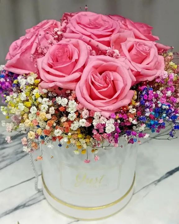 Разноцветная гипсофила и розовые розы — это гармония нежности и изящества, созданная природой. Яркие облака гипсофилы, как облака весеннего неба, окружают роскошные розы, придавая им легкость и элегантность. Лепестки роз, окрашенные в разнообразные оттенки — от нежно-розового до насыщенного малинового — излучают тепло и чувственность, придавая букету романтическое настроение.
