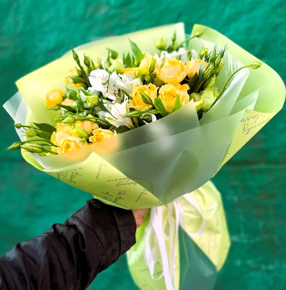 Кустовые розы, альстромерии, упаковка,лента