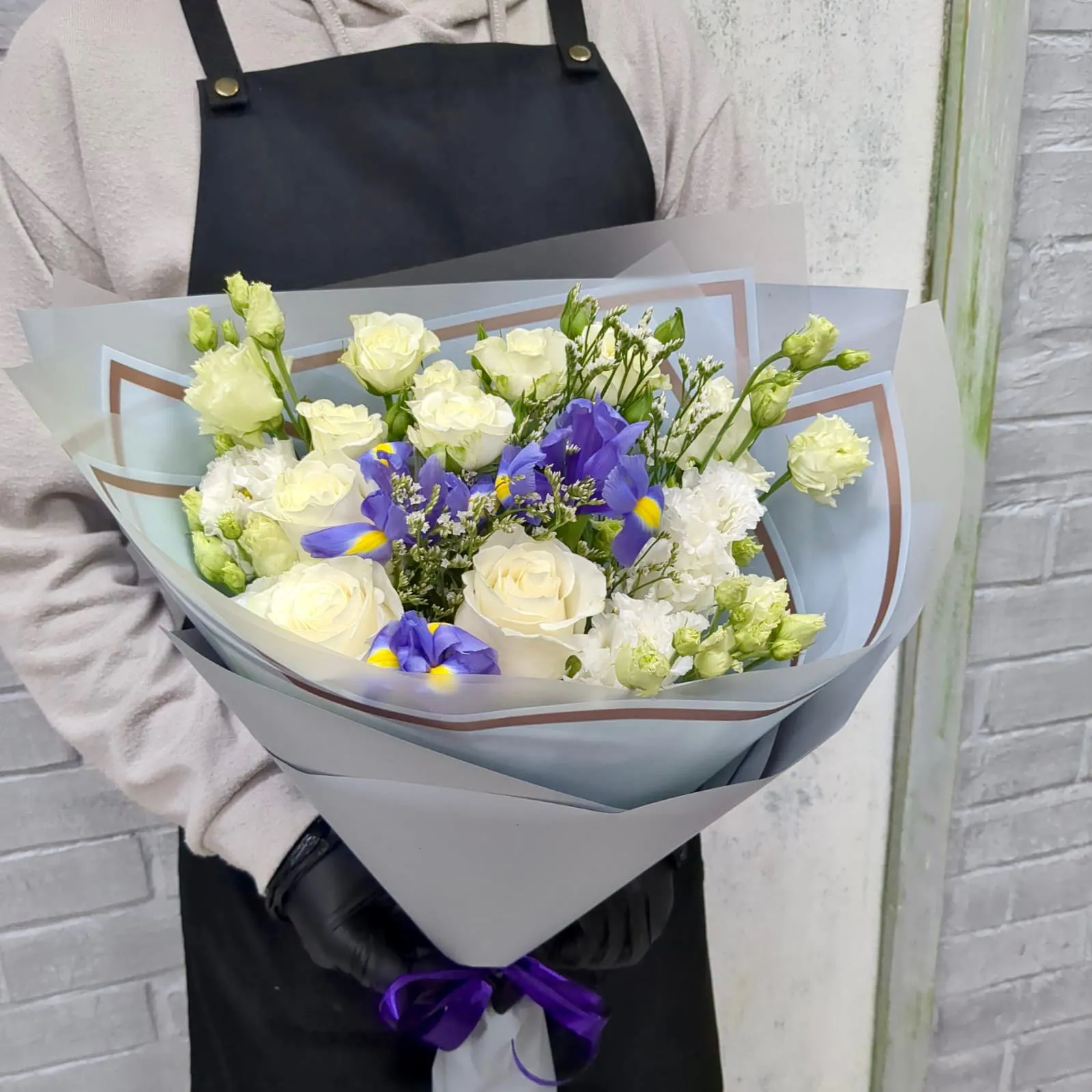 Роза, ирис, эустома, роза кустовая, зелень, упаковка, лента