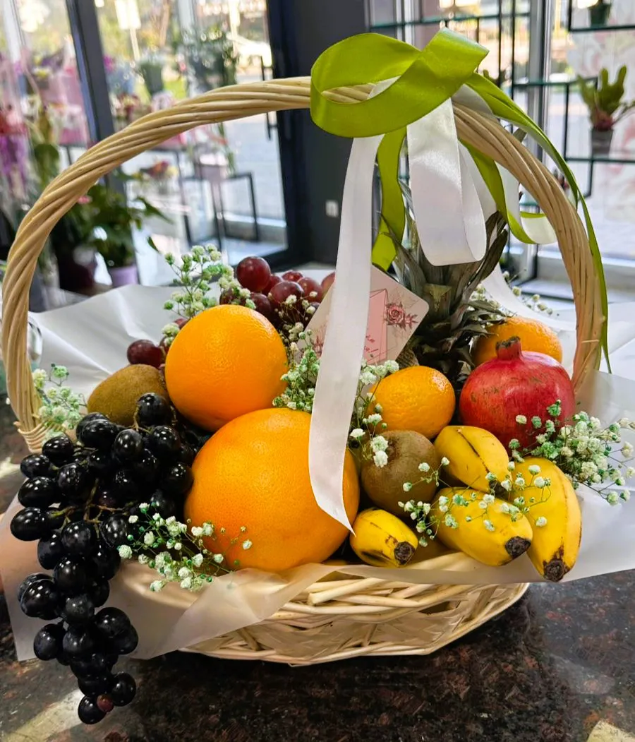 Свежие фрукты, гипсофила, корзина, лента