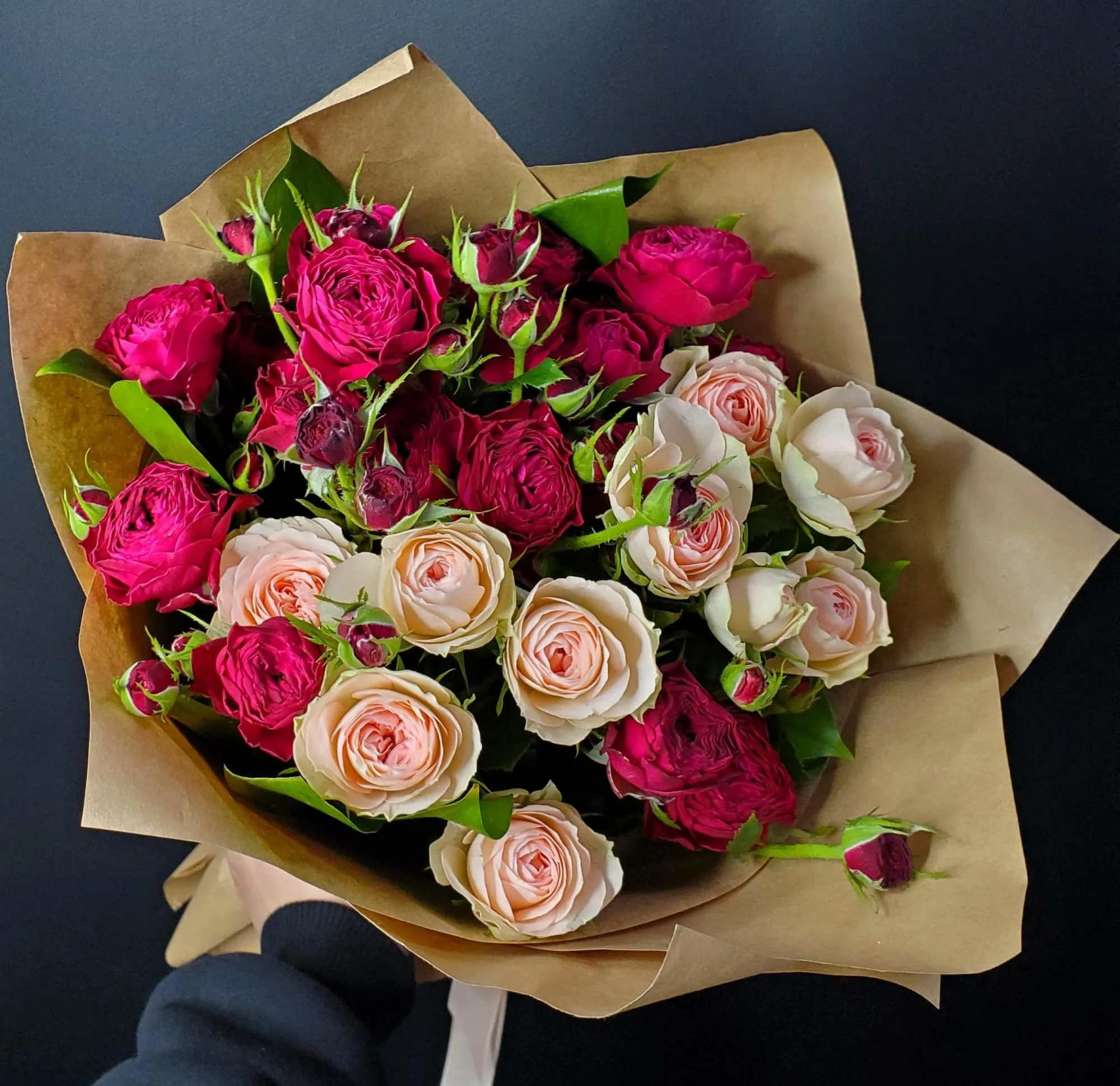 Погрузитесь в мир утонченной красоты с нашим великолепным букетом из кустовой розы. Эти миниатюрные, но невероятно выразительные цветы олицетворяют нежность и элегантность, создавая удивительное настроение в любое время года. Легкий сладковатый аромат роз создаст волшебную атмосферу уюта и романтики, делая его идеальным дополнением к любому торжеству.  Каждая роза расставлена с заботой и любовью, подчеркивая их естественную красоту и создавая гармоничное сочетание форм и цветов. Добавленные зелёные элементы дополняют образ, придавая букету свежесть и лёгкость.
